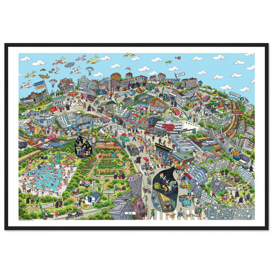 Cartoon Сity is an illustration project that redefines the medium of "busy picture", the large format image that teems people, animals and other objects, interconnected in a specific scene. These detailed world can be looked at for hours and stimulate certain play. Cartoon City is drawn, with lots of love and attention to detail, by Natasha Schwarz, who assembles the characters and objects to form your very own and distinctive map. Every new Cartoon City starts with a real map. Parts of the city, it's landmarks and attractions are exactly where they are in a real city and space. The architectural and cultural specificity of the town is easily seen despite the cartoon-like exaggeration.