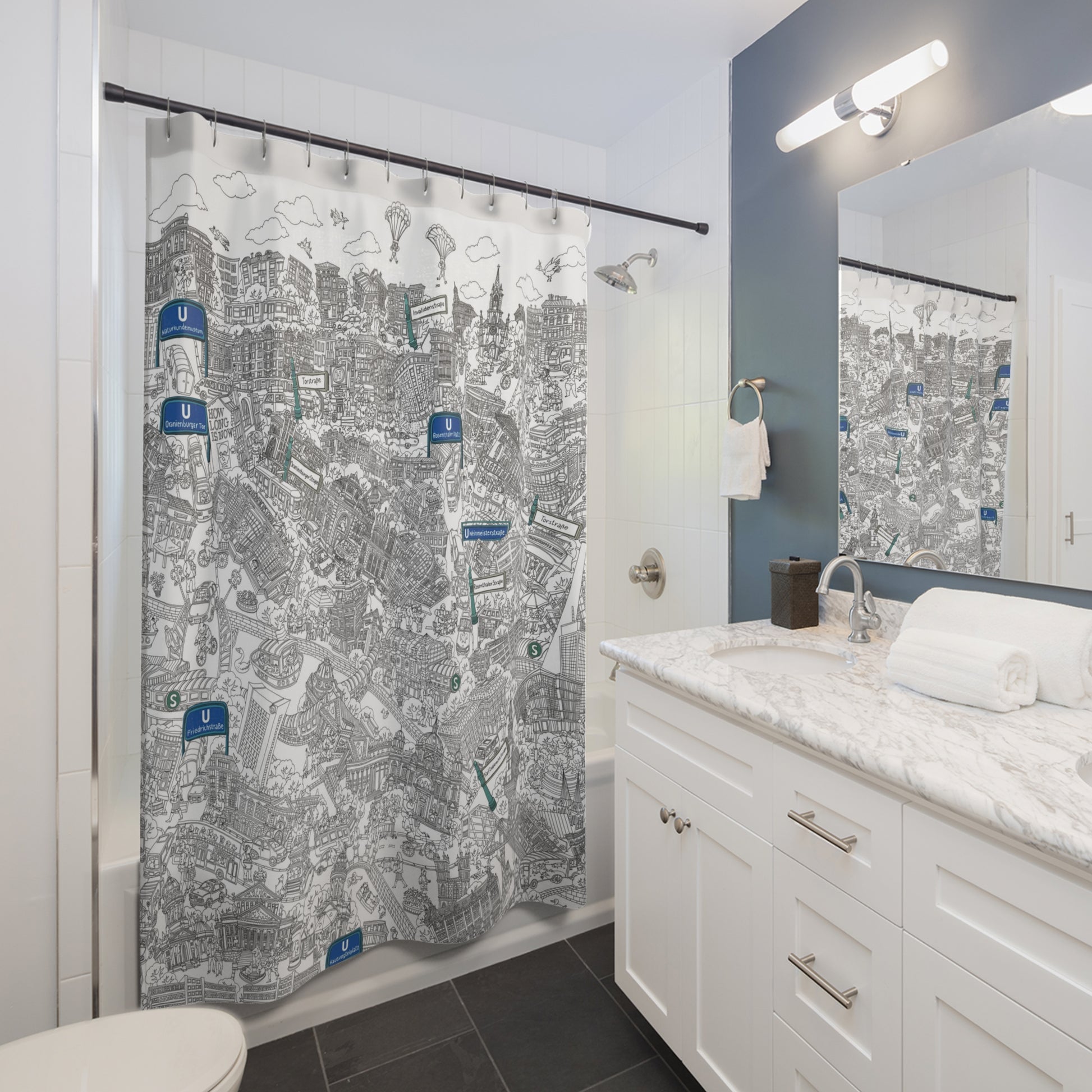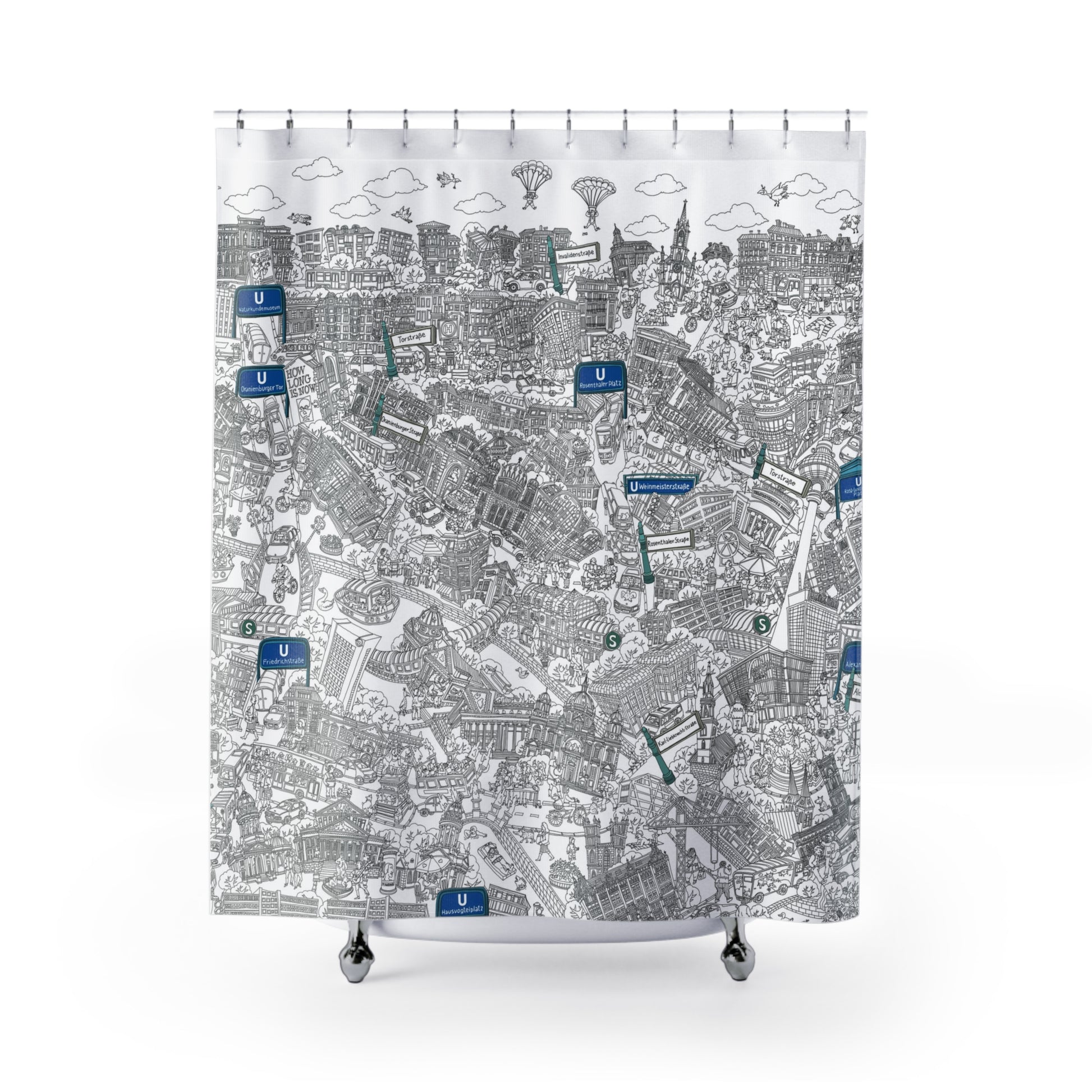 This shower curtain Berlin Mitte" — a black-and-white city map that highlights the main U-Bahn stations. The map preserves all geographic features accurately, so landmarks and neighborhoods are clearly recognizable.