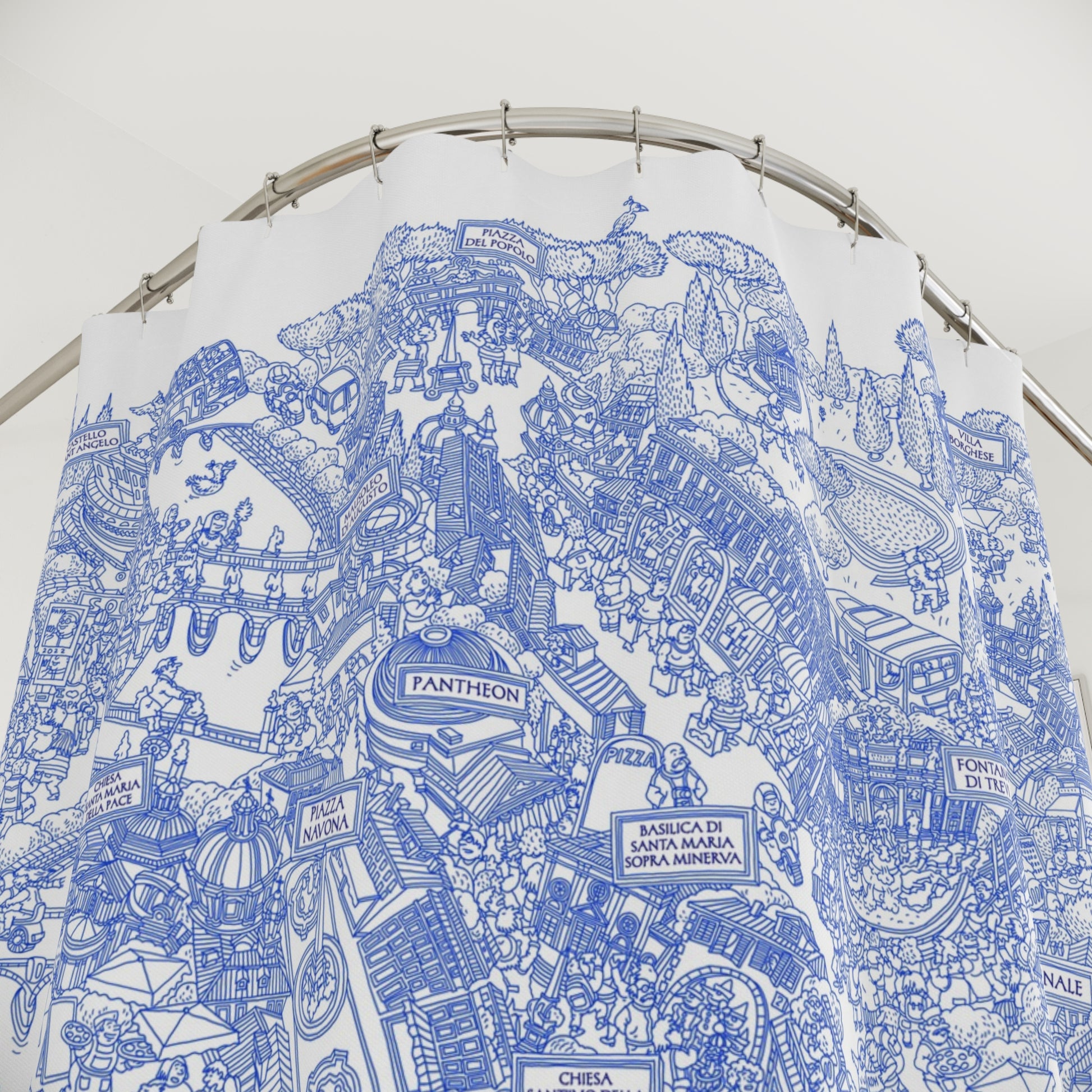 Blue Doodle City Shower Curtain — Hand-Drawn Urban Map Bath Decor