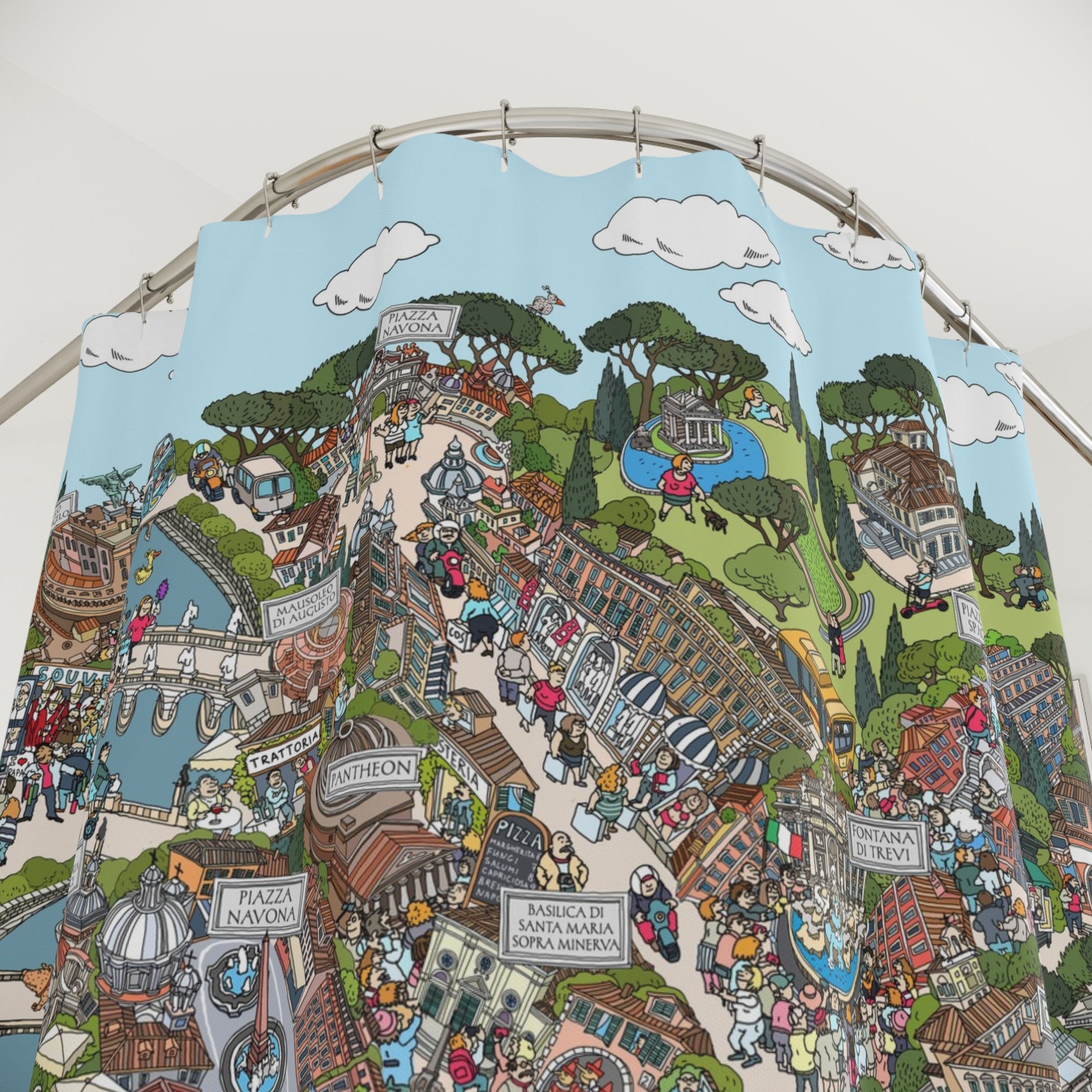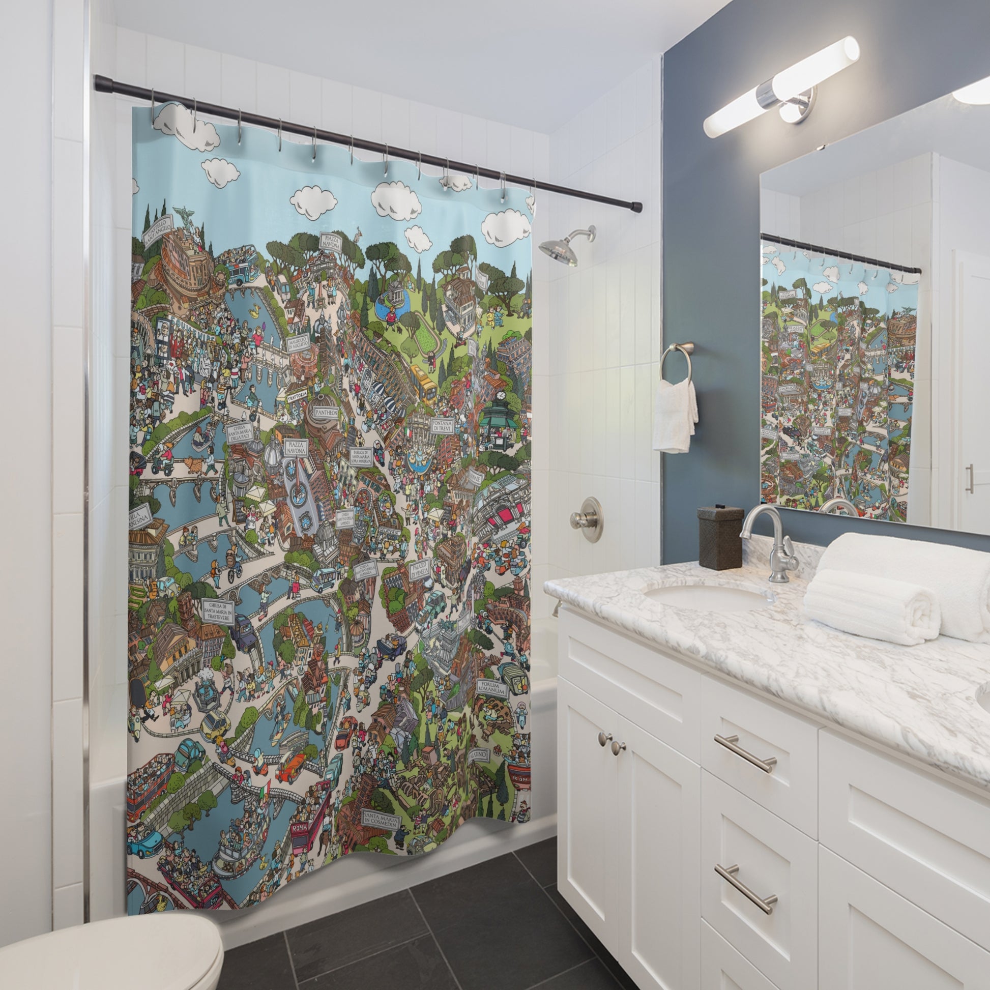Whimsical Cityscape Shower Curtain — Detailed Illustrated Town Map Design